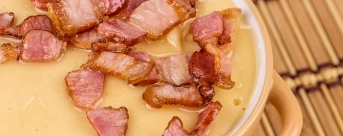 Foto: da fonti aperte Zuppa di fagioli con formaggio fuso e pancetta, preparata in modo molto rapido e semplice, senza brodo bollente Il piatto risulta