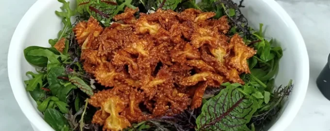 - Disporre su un piatto le foglie di lattuga, le cipolle affettate, la salsa e la pasta croccante. Mescolare l’insalata ed è pronta da mangiare.
