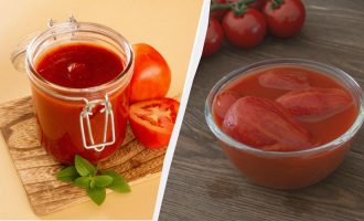 Tritare finemente il pomodoro, mandarlo in padella, aggiungere il concentrato di pomodoro, sale, pepe e far cuocere il tutto a fuoco lento.