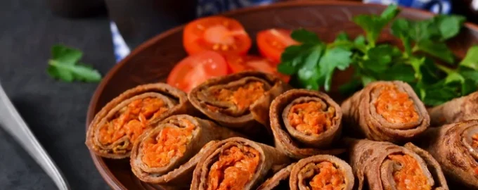 - Spennellare la superficie di ogni pancake con un sottile strato di crema all’uovo, disporre il ripieno di verdure sul bordo del pancake e arrotolare a involtino.